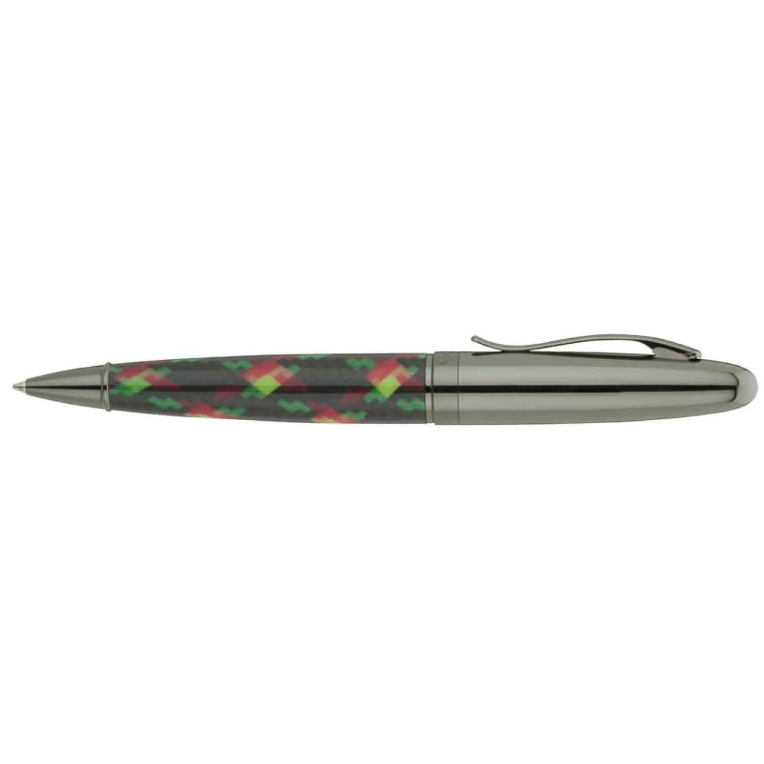 Solid brass cap and trims, colorful carbon fiber barrel, state-of-the-art laser-engraved logo, cap-off design, ink color black. Complies with Prop 65.