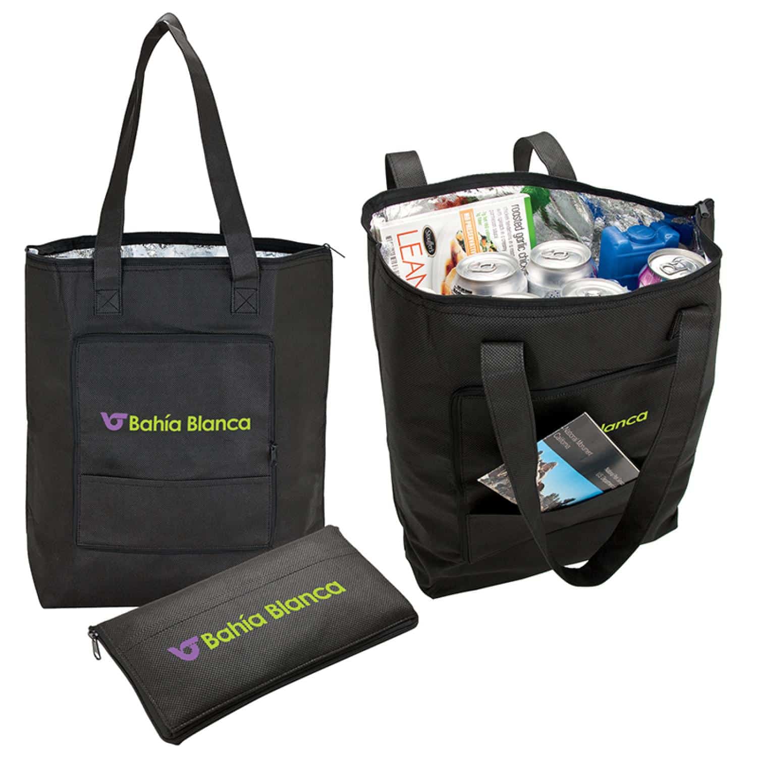 Foil insulated grocery shopper with zippered closure, outer pocket and 24″ handles, folds down to easy 9″ x 4 5/8″ carry size. Complies with Prop 65. 12″ W x 15 1/2″ H x 5 1/4″ D