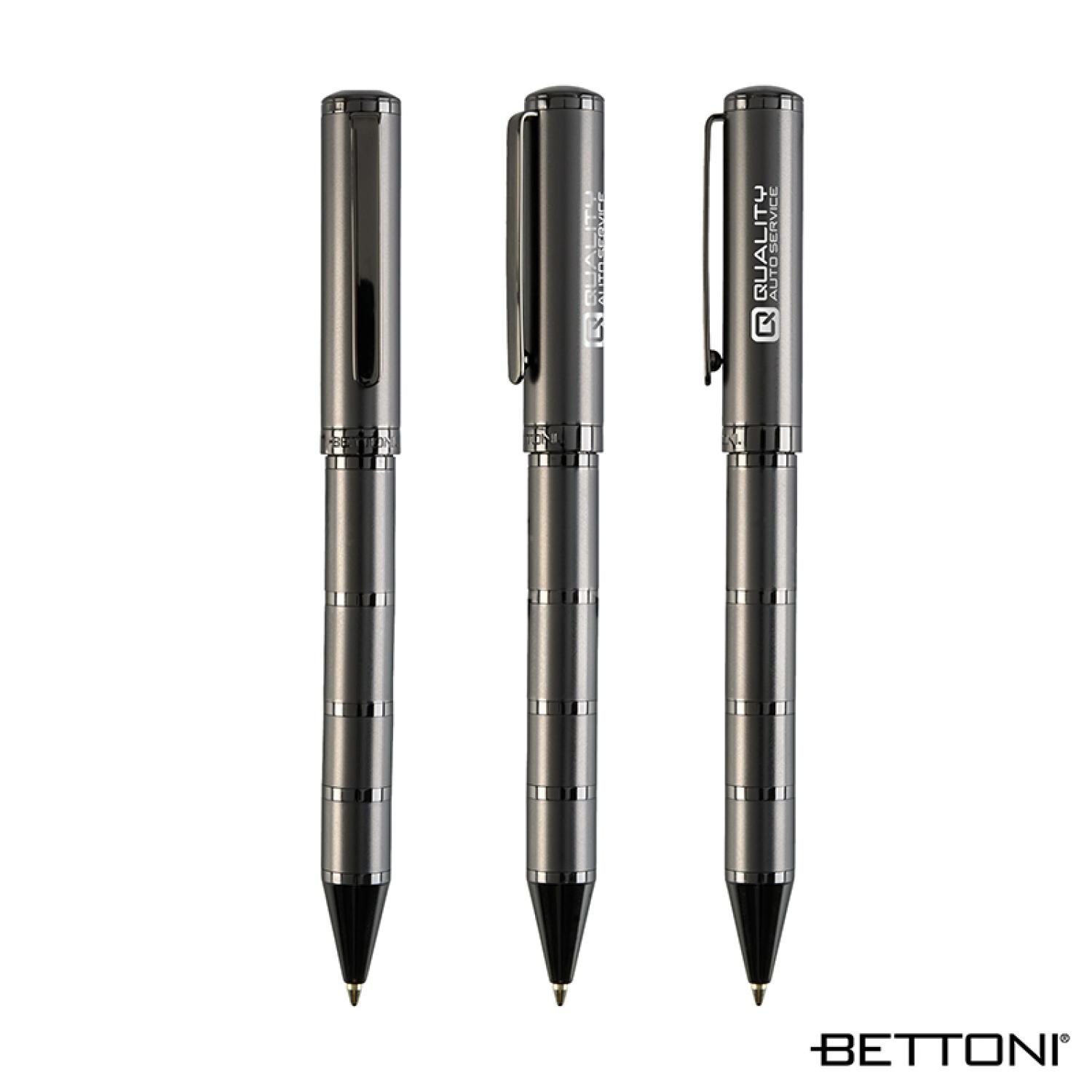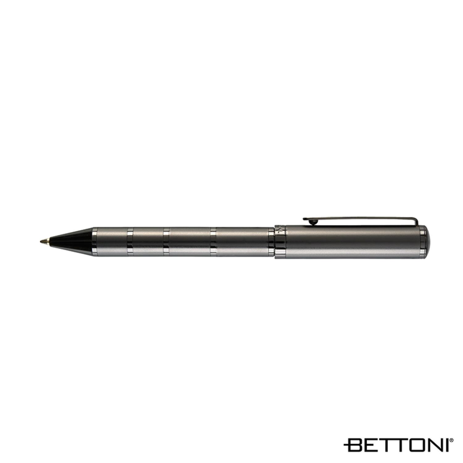 The Venezia Rollerball Pen from Bettoni is a sophisticated writing instrument designed for those who value quality and style. It features a German-made, easily replaceable black ink cartridge, ensuring smooth, long-lasting performance. With its sleek design, the pen showcases a heavy weight brass construction and an elegant matte metallic gunmetal finish with high gloss contrasting trims and barrel rings. The twist-action mechanism allows for effortless use, while the ergonomically balanced weight ensures a comfortable and consistent writing flow. Perfect for both professional and personal use, the Venezia Ballpoint Pen combines elegance, functionality, and everyday reliability in one timeless package. Each Bettoni writing instrument is packed in a black triangle gift box. Complies with Prop 65. 1/2″ W x 5 1/2″ H x 5/8″ D