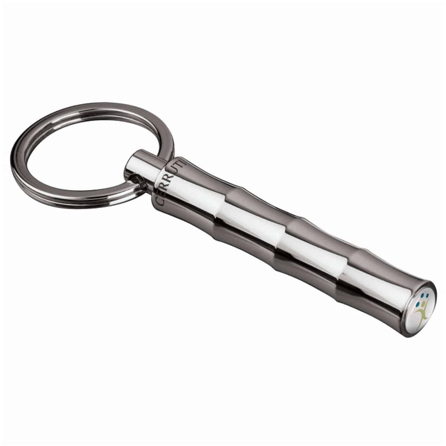 Elegant chrome bamboo design keyring. Packaged in black giftbox. Complies with Prop 65. 1/2″ W x 2 7/8″ H x 1/2″ D
