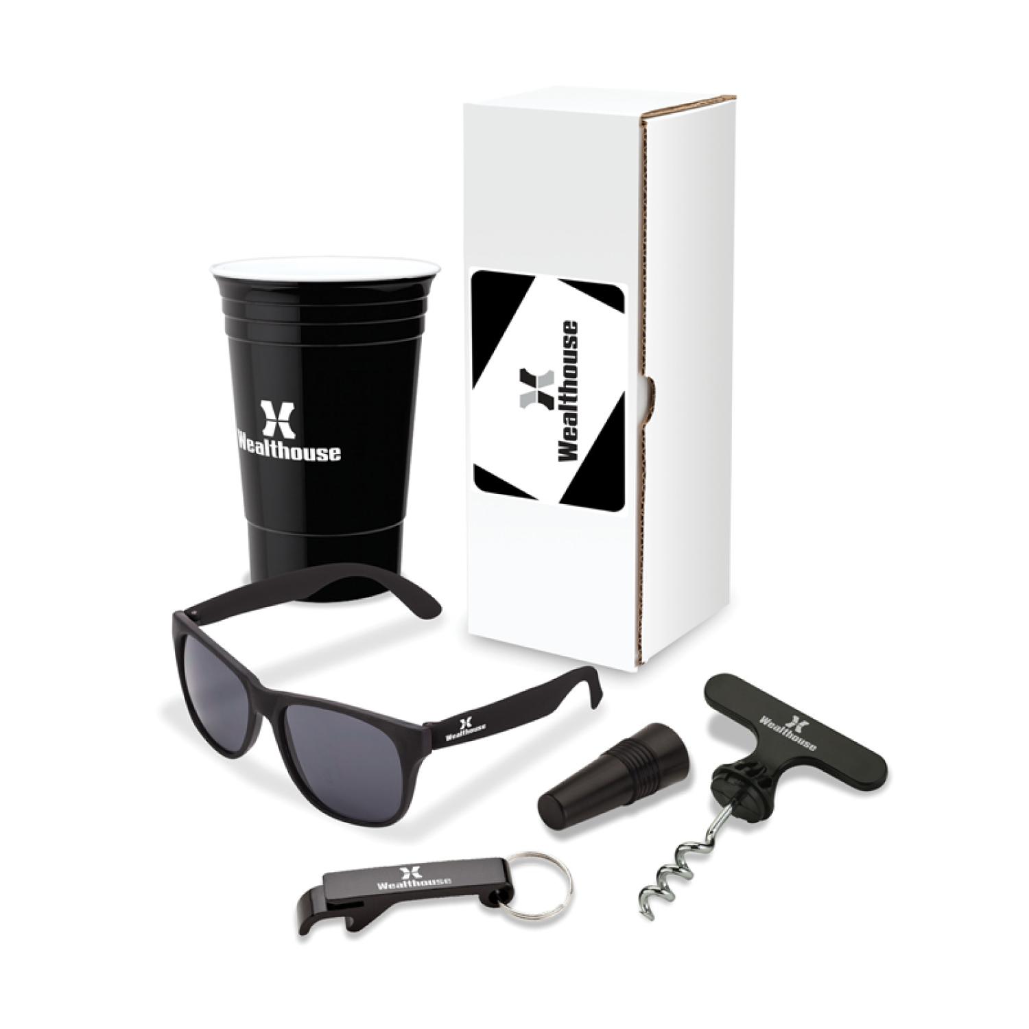 The Festival 4-Piece Picnic Gift Set has your favorite picnic items packaged together in a custom gift box! The 16 oz. double wall recycled polypropylene coffee tumbler helps maintain beverage temperatures for on the go. Wear the sunglasses with the tinted UV400 polycarbonate lenses and matte-finished frames to protect your eyes from the sun as you relax and enjoy your picnic. This set also includes an aluminum bottle opener keyring with a can tab lifter and a 2-in-1 corkscrew bottle opener and bottle stopper. Show appreciation and gratitude to your employees and business partners by gifting them with the Festival gift set. Complies with Prop 65. 4″ W x 6 1/8″ H x 4″ D
