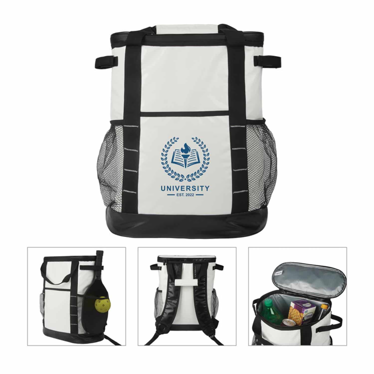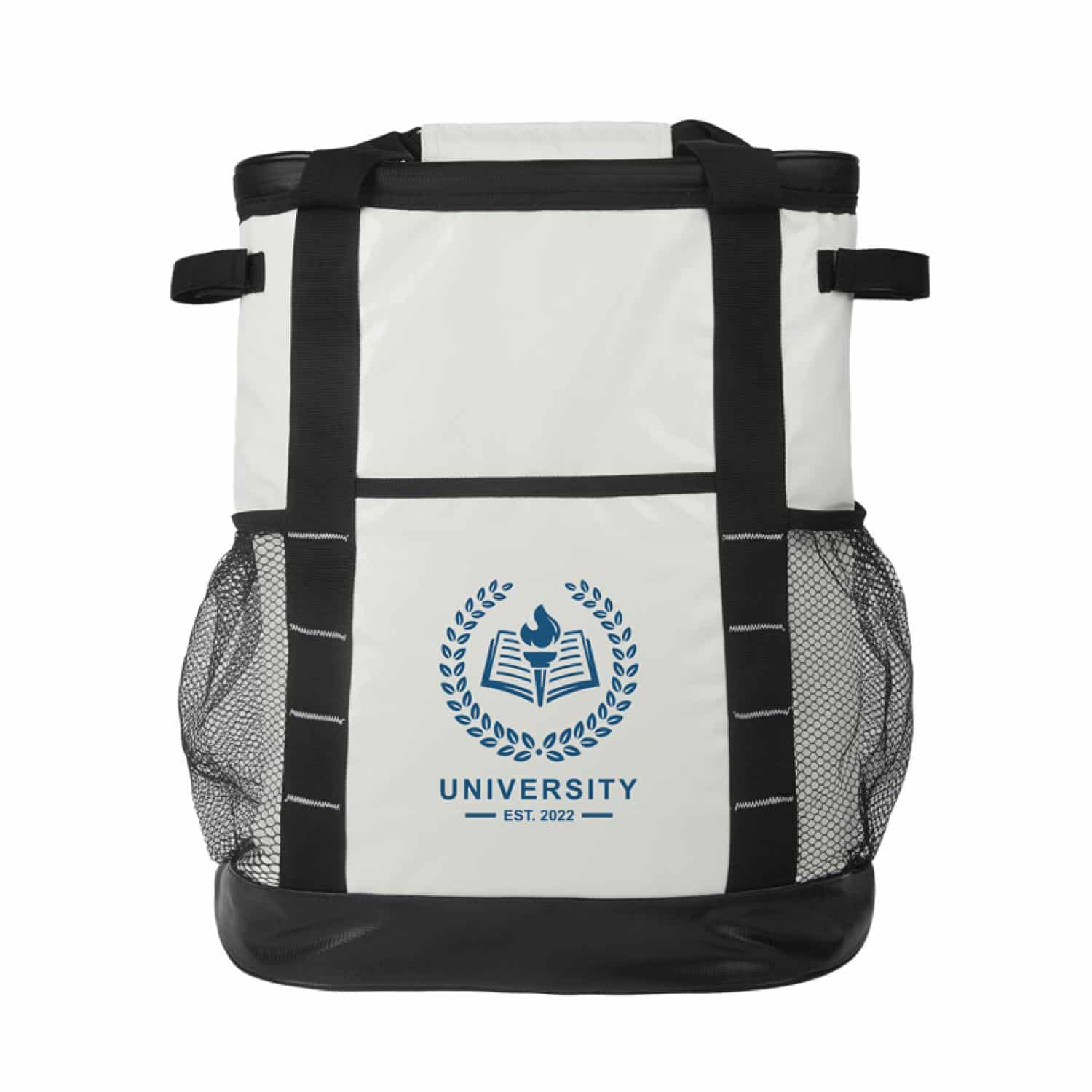 The Glacier 24-Can Cooler Backpack is a durable and functional choice for outdoor enthusiasts. Crafted from robust water-resistant 45C PVC Tarpaulin, this bag is both lightweight and durable and ensures your refreshments stay cool and protected in any weather. The spacious zippered main compartment features a heat-sealed PEVA lining and thick foam insulation, providing optimal temperature retention for up to 24 cans. The Glacier Backpack also includes a front pocket and two side mesh pockets, large enough to hold water bottles or pickleball racquets and balls. Transport is convenient with hook and loop side carry handles to accommodate larger items or securing in truck beds and the main carry handles feature a hook & loop grip for a comfortable carry. For longer journeys, the padded and adjustable backpack shoulder straps offer a comfortable hands-free option making it a reliable, versatile, and stylish companion for all your adventures. Complies with Prop 65. 14 3/4″ W x 16″ H x 7″ D