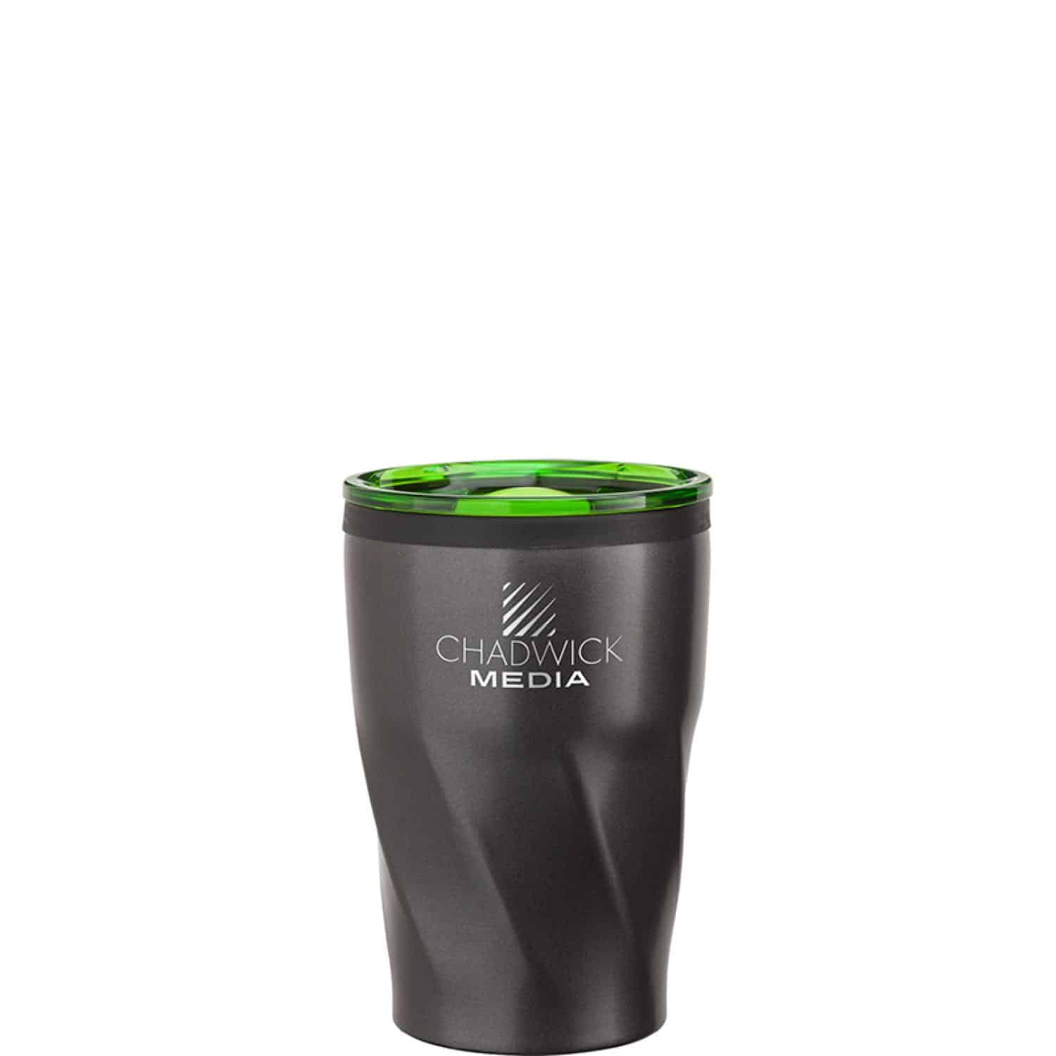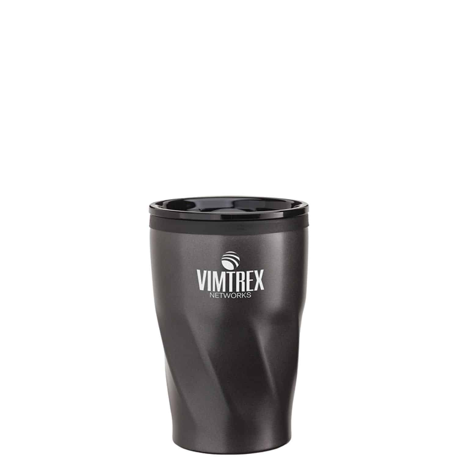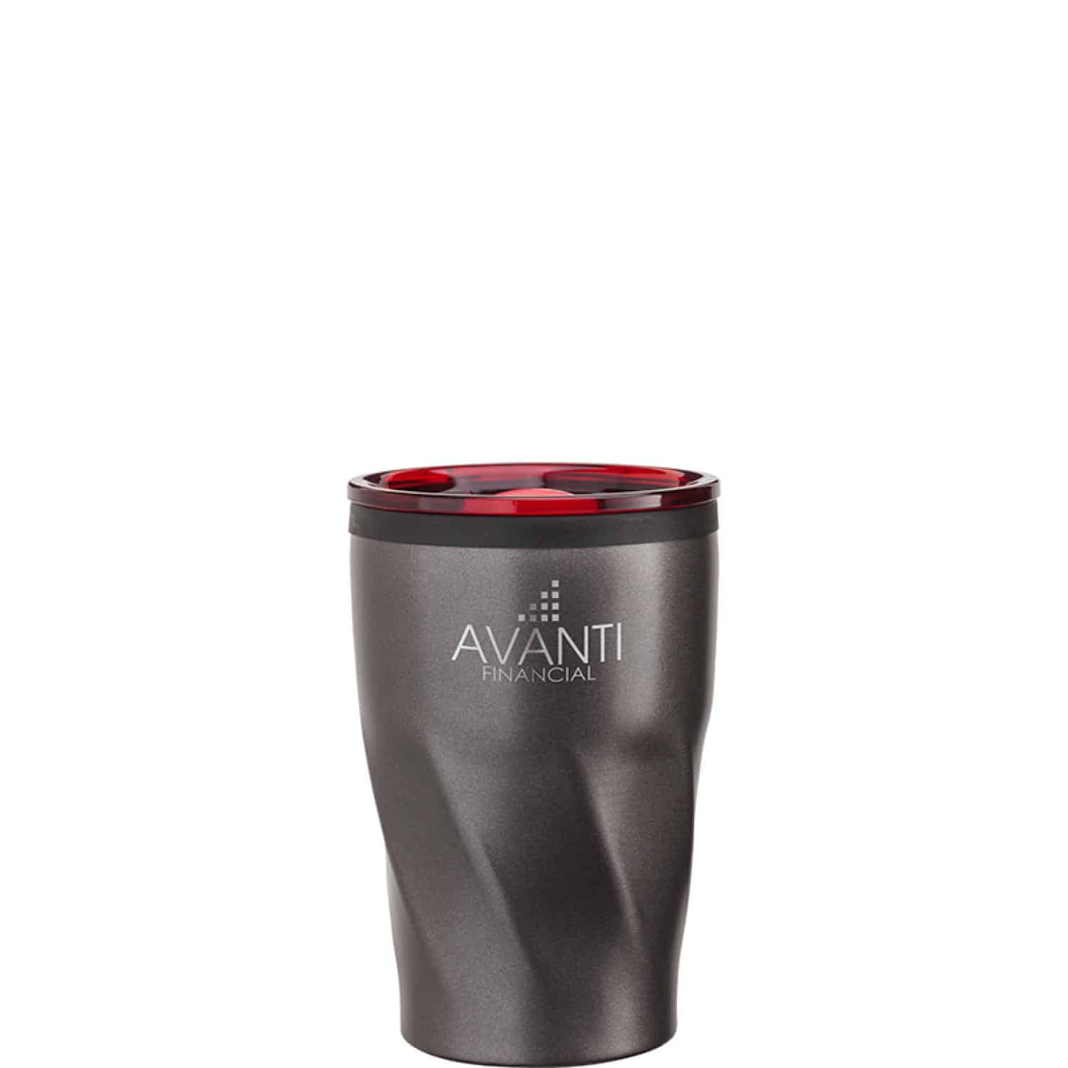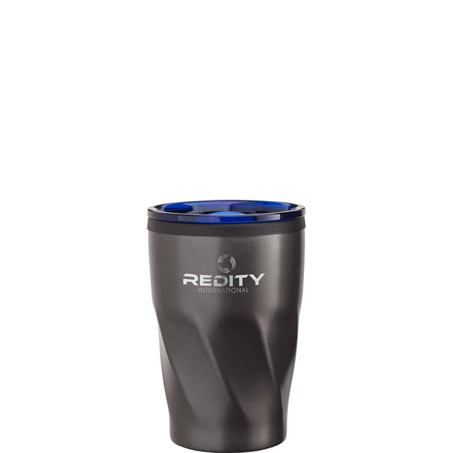 The Kaf 12 oz. coffee tumbler is the perfect fit for most single serve coffee brewing systems. The double wall construction with a stainless steel outer wall protects your hand from the heat while you enjoy a cup of joe. The translucent colored easy sip lid with a silicone ring and sliding opening to prevent spillage, couples with the attractive gunmetal coating and comfortable twist grip. This cup’s non-slip base makes it the perfect desk companion, or take it in your car as it fits most car cup holders. FDA compliant and BPA free. Complies with Prop 65. 3 3/8″ W x 5 1/8″ H x 3 9/16″ D