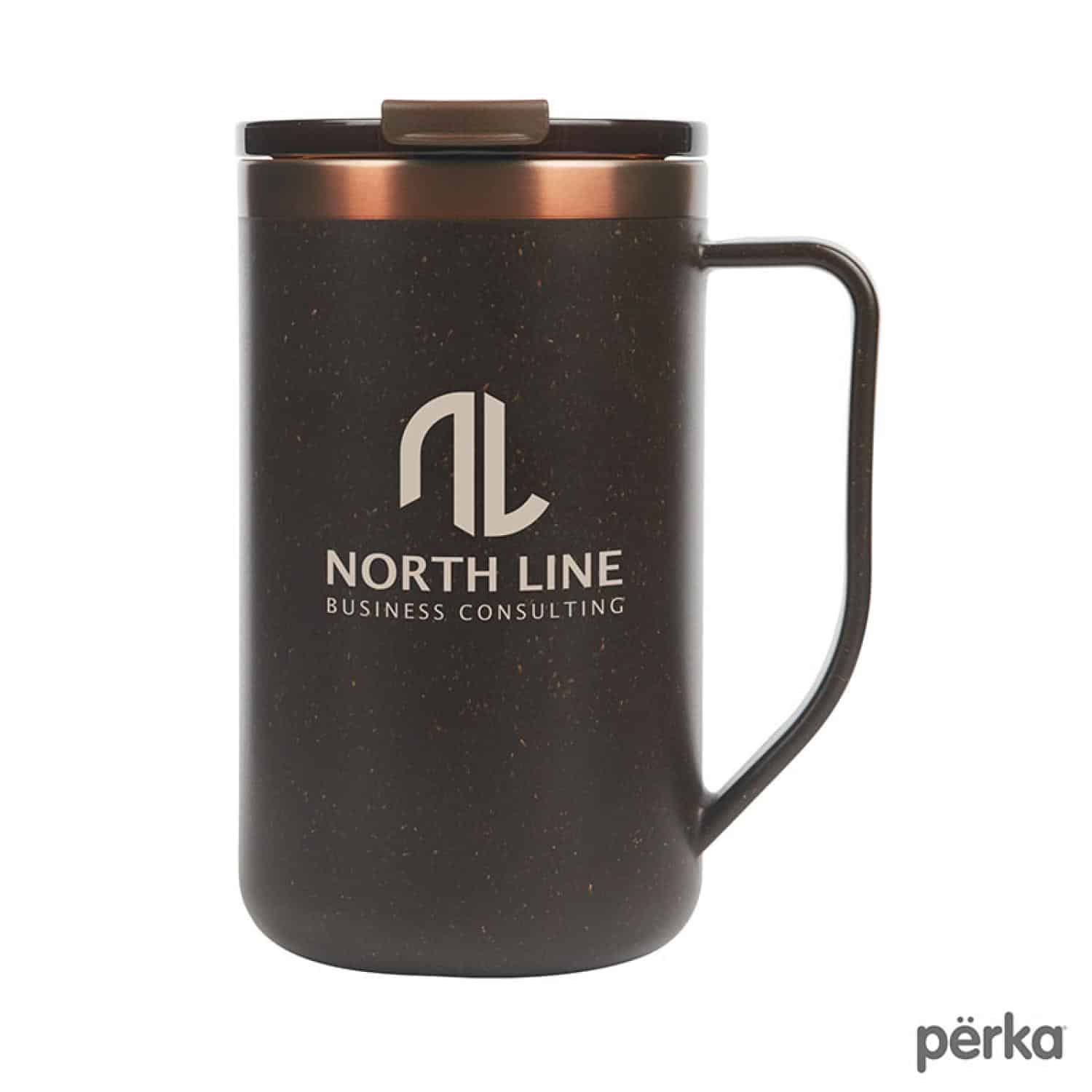 Choose the Perka 15 oz. Guji Coffee Mug to experience the perfect blend of style, sustainability, and practicality. With a nod to love for coffee, the outer wall and handle of the mug are crafted from a unique blend of recycled coffee grounds and recycled polypropylene, and the inner wall is made of post-consumer recycled 18/8 stainless steel making this mug an eco-conscious choice. This coffee mug comes with a transparent push-on lid allowing you to keep an eye on your beverage levels and the flip closure reduces the risk of spills while you are on the move. A touch of elegance is added to the design with a copper trim enhancing the visual appeal of the mug. Choose the Perka Guji coffee mug for sipping your favorite beverages with the warmth of sustainability in your hands. BPA Free and FDA Compliant. A portion of all proceeds is donated to Shelter to Soldier, a non-profit organization that rescues dogs to train as service animals for veterans in need. Complies with Prop 65. 4 3/4″ W x 6 1/4″ H x 3 5/8″ D