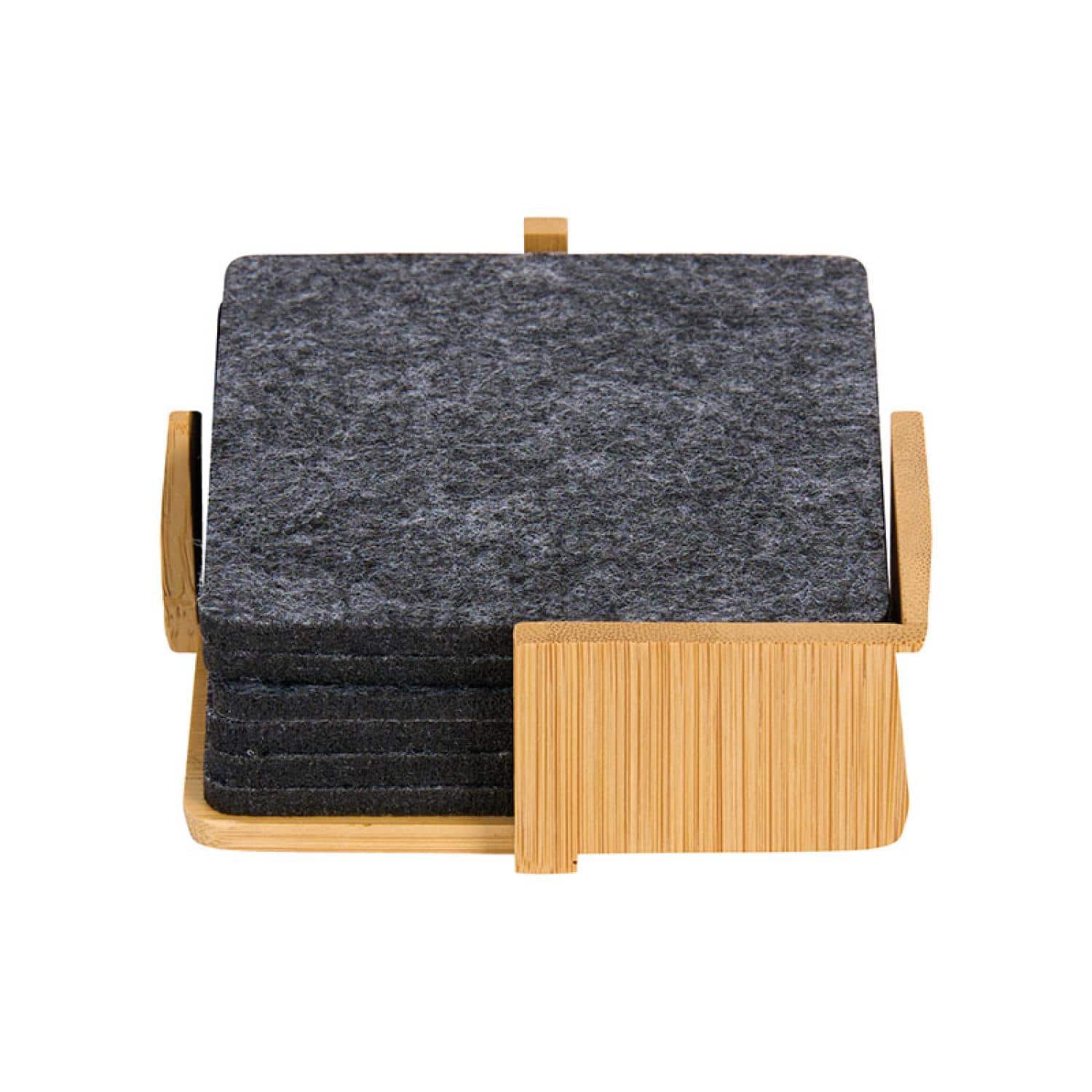 The Redmond 6-piece coaster set combines sustainability with style, featuring felt coasters made from recycled PET bottles (RPET) and a base crafted from natural bamboo. The coasters provide an eco-friendly solution for protecting your surfaces, while the bamboo holder adds a touch of natural elegance to your home or office. Designed with both functionality and environmental responsibility in mind, this set is perfect for those who appreciate sustainable living without compromising on quality or. Complies with Prop 65. 4 1/8″ W x 1 1/2″ H x 4 1/8″ D