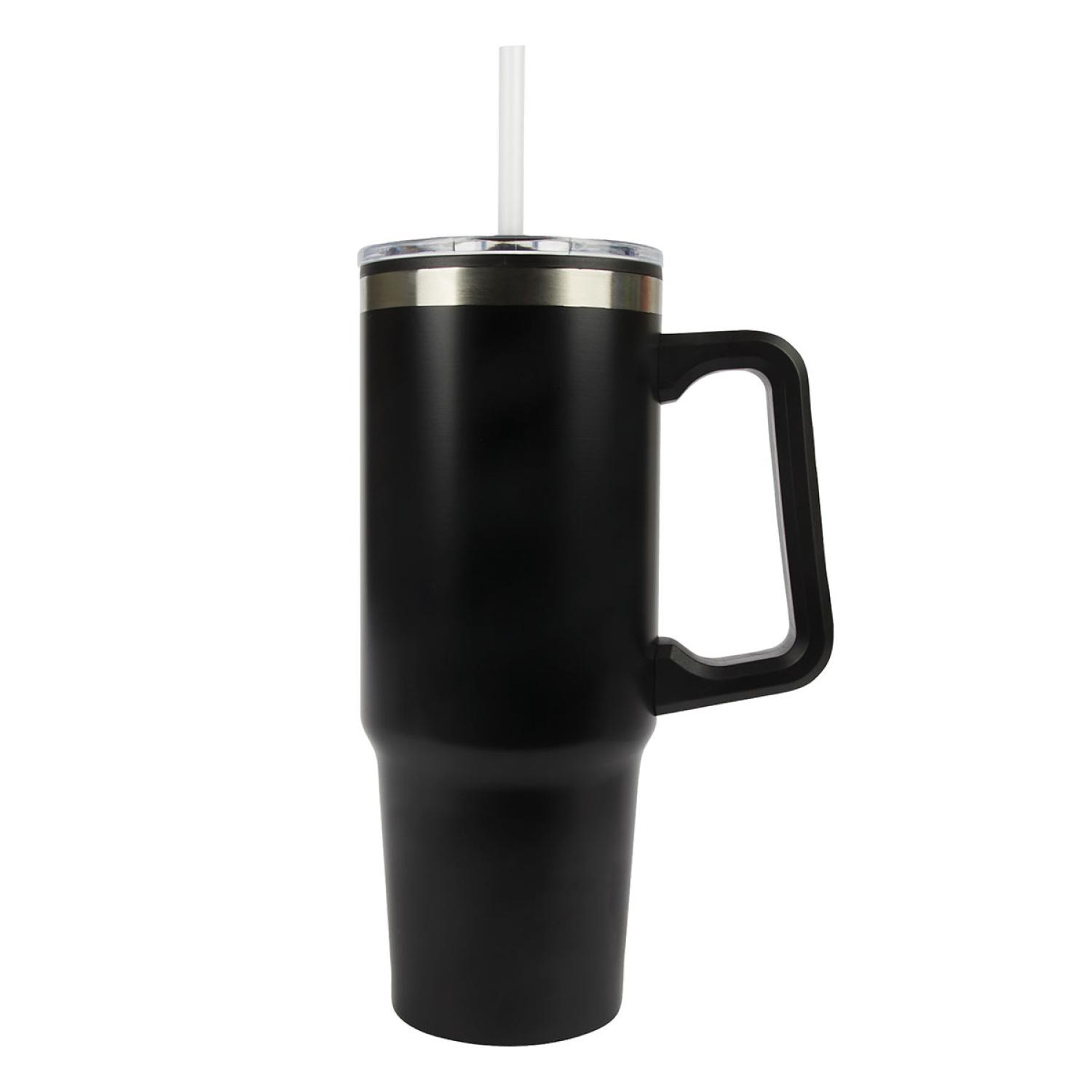 Whether you’re starting your day with a hot cup of coffee or cooling off with iced tea on a warm afternoon, the Rhea 30 oz. Mug delivers everyday convenience and versatility. It features a durable stainless steel outer wall paired with a 100% recycled polypropylene inner wall, creating a lightweight design thats easy to carry wherever you go. The translucent push-on lid includes a slide closure for hot beverages, while the included straw makes sipping cold drinks effortless. An ergonomic, sturdy handle ensures a comfortable, secure grip, and the mug fits most standard car cup holders for added convenience on the road. FDA compliant and BPA-free. Complies with Prop 65. 5 3/8″ W x 8 7/8″ H x 3 7/16″ D