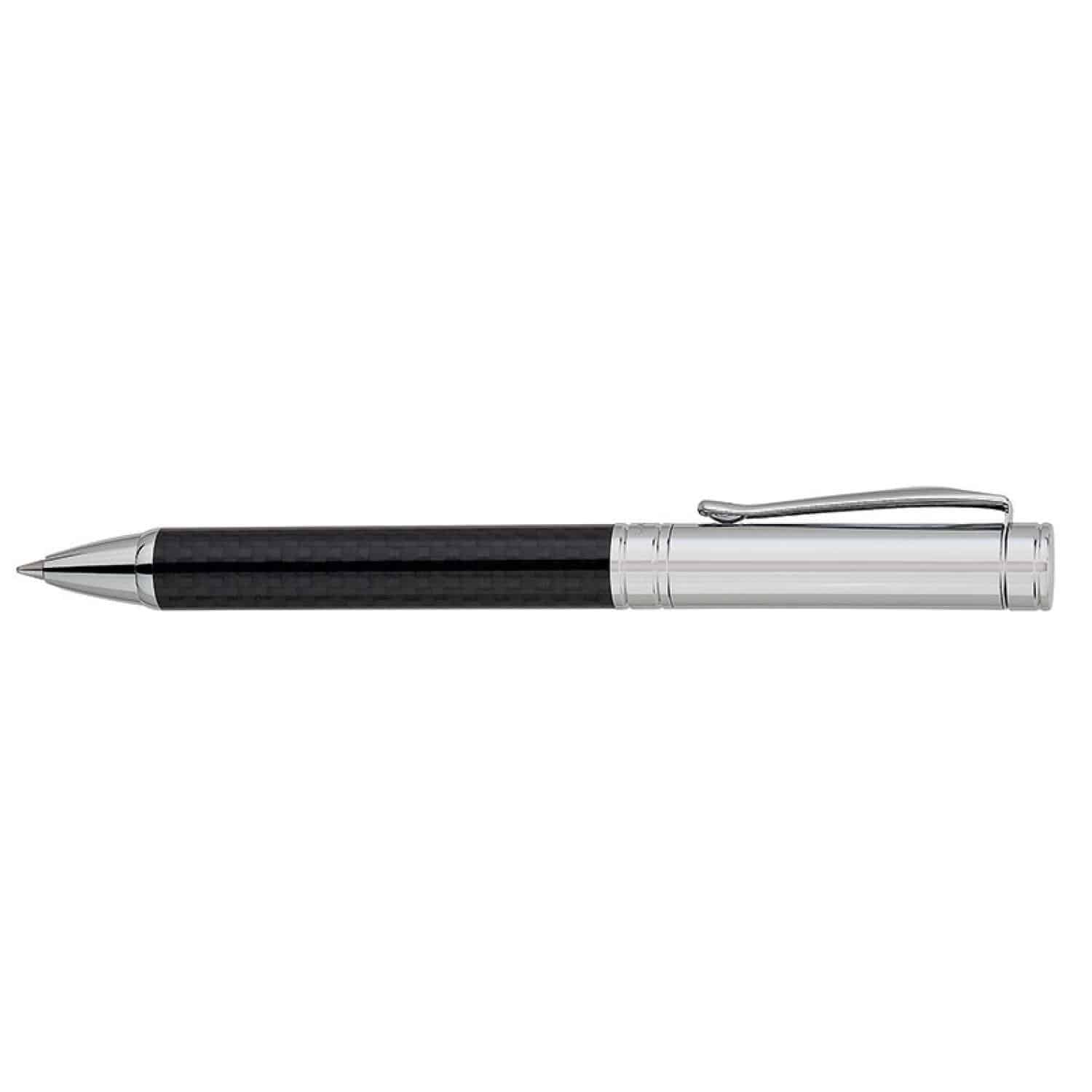 Twist mechanism brass ballpoint pen with silver glass fiber or black carbon fiber barrel and USA made ballpoint refill. Complies with Prop 65. 3/4″ W x 5 1/4″ H x 7/16″ D