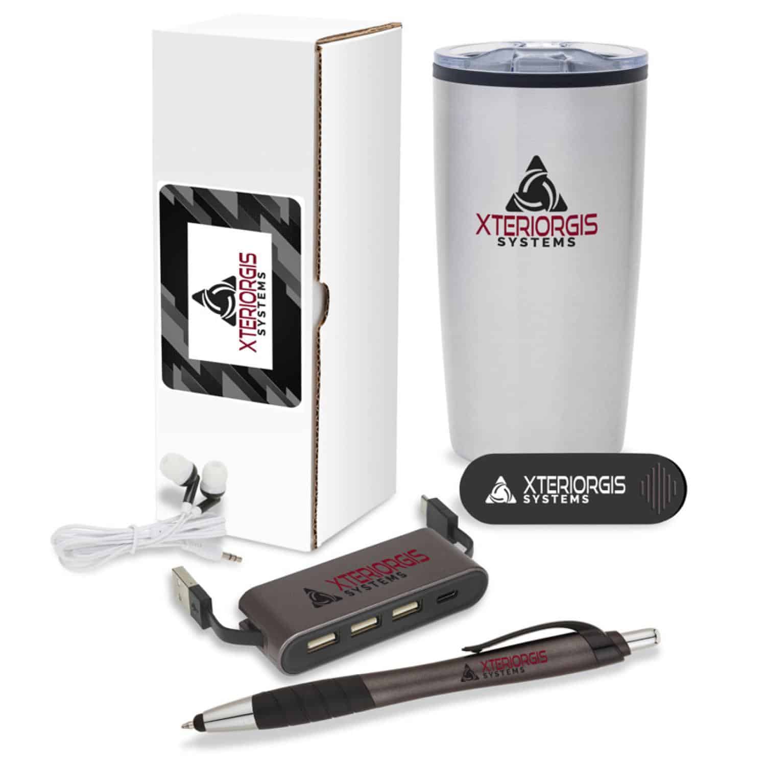 The Splendid 5-Piece Welcome Gift Set includes thoughtful gifts that can be used daily packaged together in a customized giftbox. The 20 oz. stainless steel, double wall tumbler has a colored polypropylene inner liner with sliding closure lid and non-slip base pad. The set also includes stereo earbud headphones with a 46″ cable and color accents, a multi-use phone grip that can also be used as a phone stand and a plunge-action ballpoint pen/stylus that can be used in the office or at home. The four-port 2.0v USB hub has two cables to connect or charge your standard Type A devices to a traditional Type A port or a newer Type C port. Get the Splendid 5-Piece Welcome Gift Set for your next new employee orientation meeting. Complies with Prop 65. 3 1/2″ W x 7 1/16″ H x 3 1/2″ D