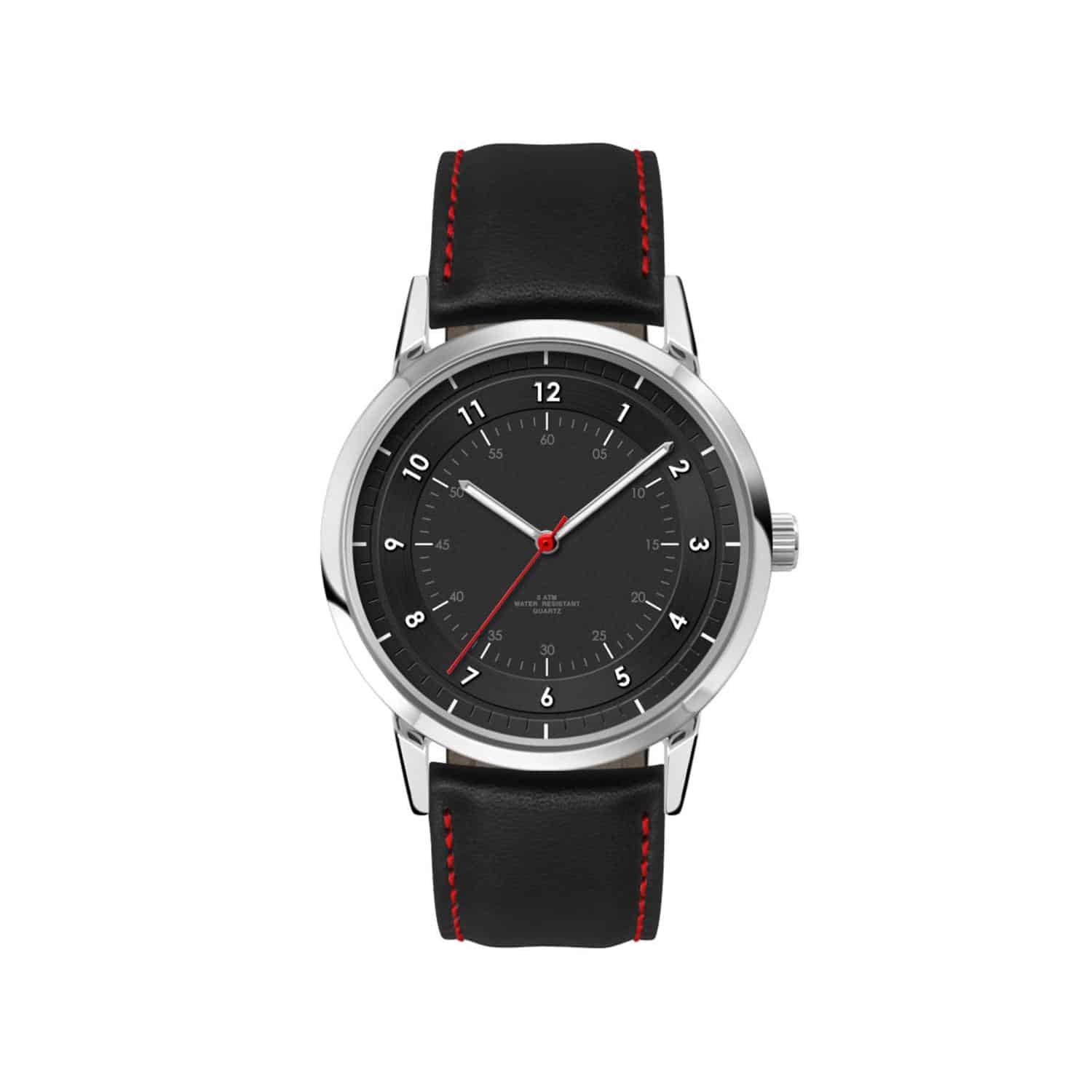 42mm Polished Brushed Silver and Black Metal Case, High Precision Japanese Movement, Date Display, Flat Mineral Crystal, Natural Leather Straps, Water Resistant to 3 ATM. Complies with Prop 65. 1″ W x 1″ H x 1″ D