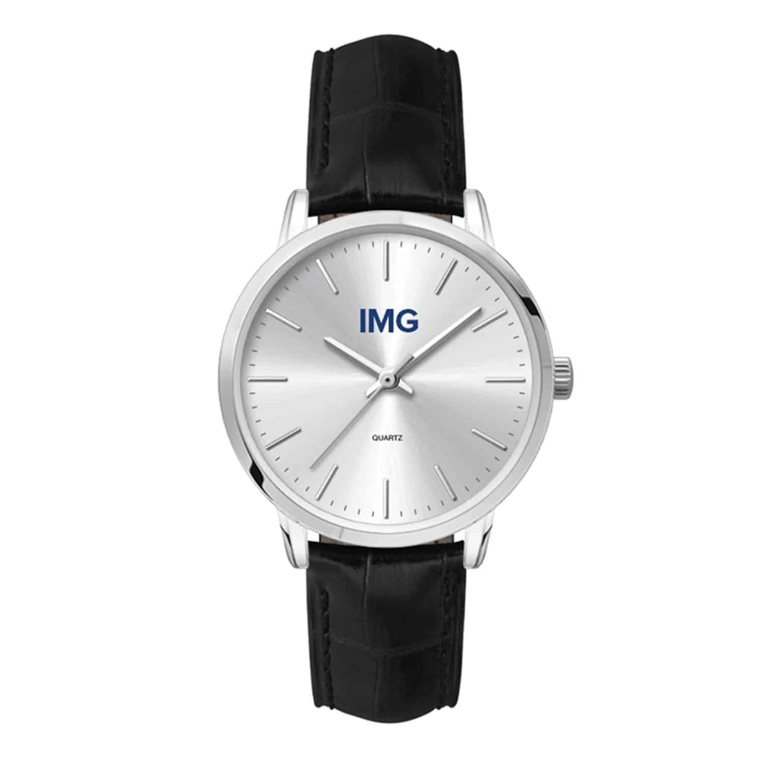 30.5mm metal silver case, 3 hand mvmt, silver dial, leather strap, flat mineral crystal, 3 atm wtr resistant. Complies with Prop 65. 1″ W x 1″ H x 1″ D