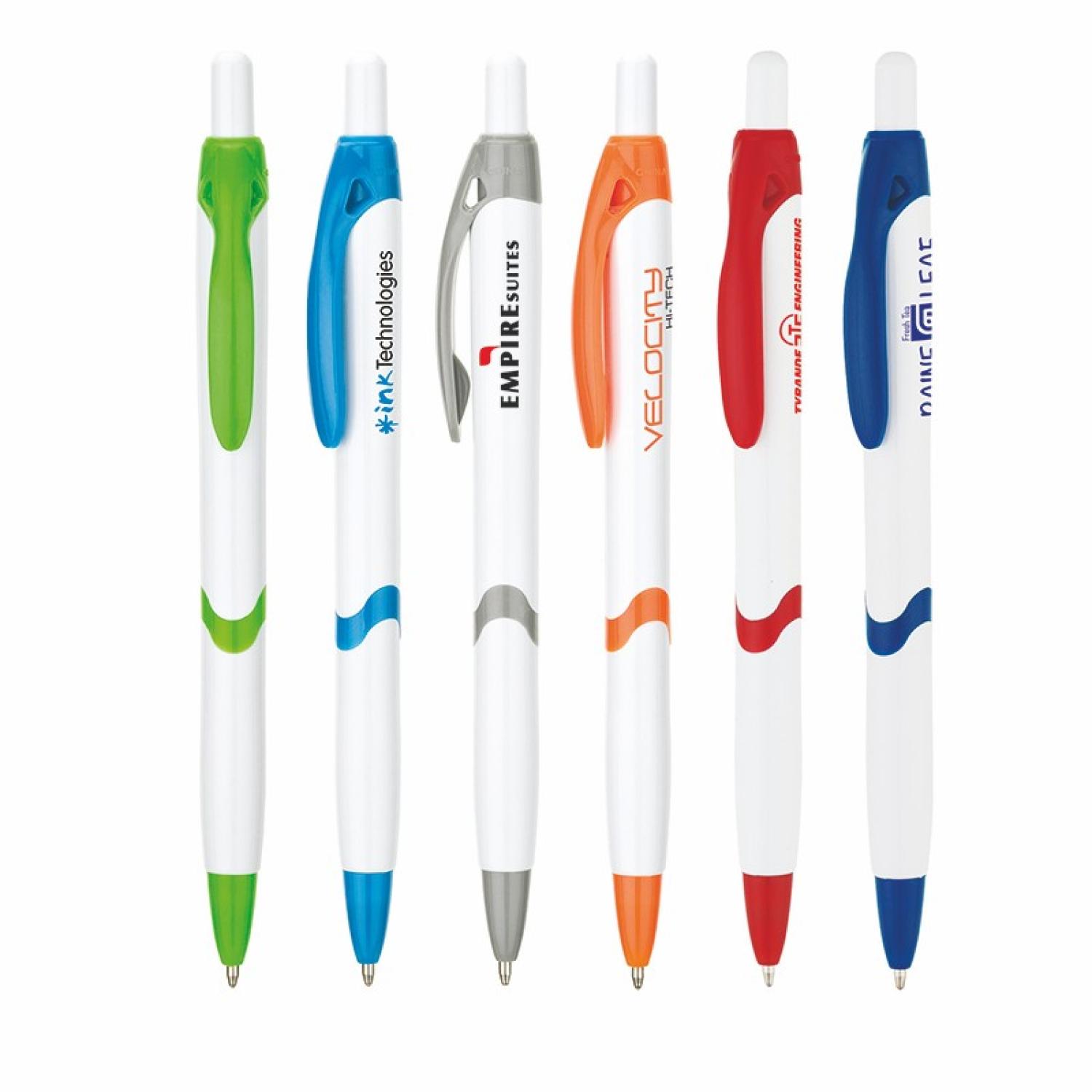 Plunge-action ballpoint with white barrel, colored clip and wavy ring accent. Complies with Prop 65. 5/8″ W x 5 1/2″ H x 1/2″ D